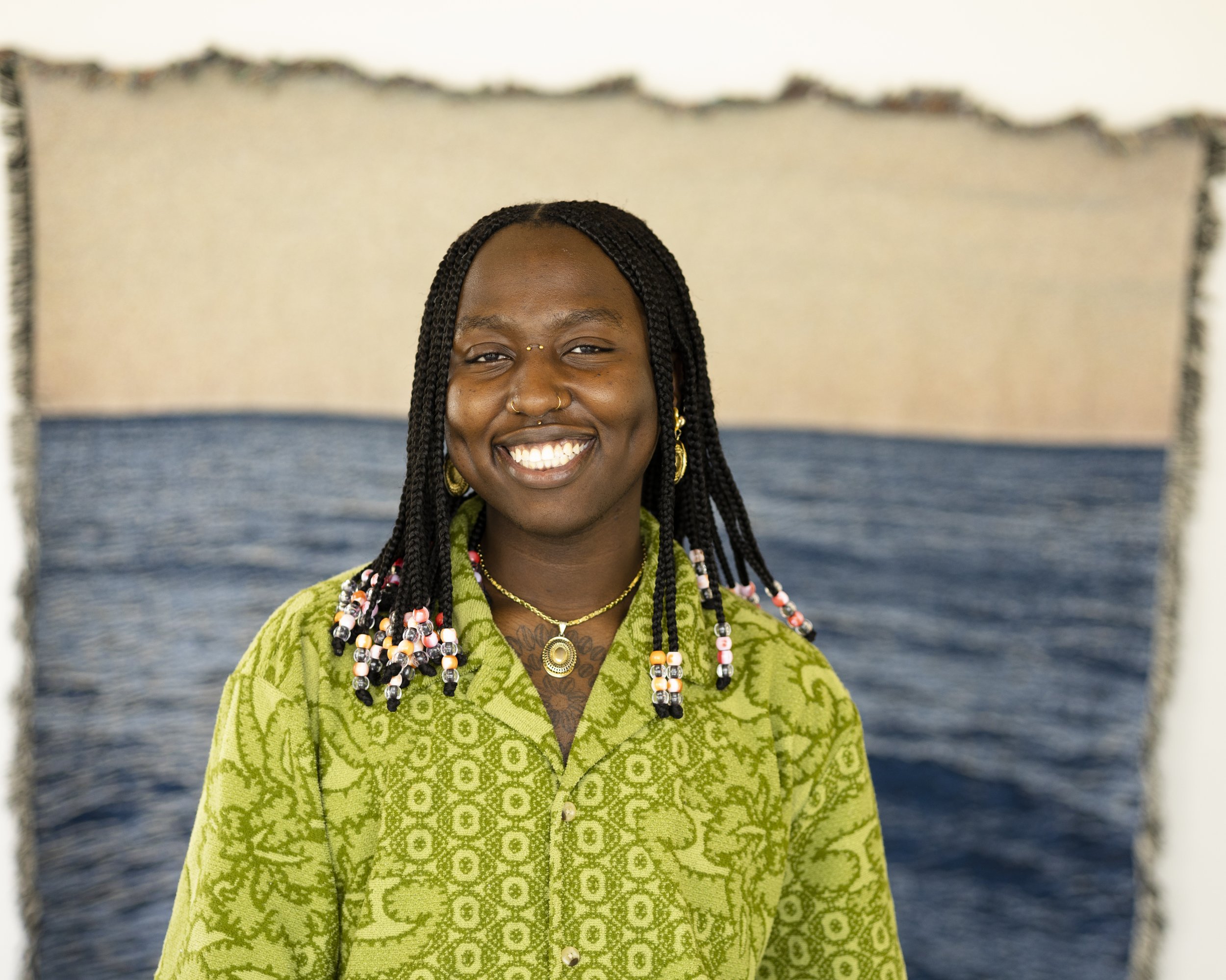 Oreoluwa Akinyode, the Living Breathing archive of what was, what is, and what will be. Through the use of images, moving images, and text, Oreoluwa crafts worlds where their multitudes have a place to exist. Their work exists as a living prayer, a portal that acts as a catalyst for change. Oreoluwa was the inaugural 2022 JUST/Start 1st place prize winner which helped start their business IREWOLE STUDIOS, where they launched their IRE OMI, the blessings of the waters, woven water photo blankets.